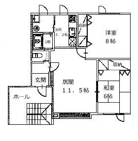 【間  取】2LDK 居間11.5帖、台所3.2帖、洋室 8帖、和室6帖